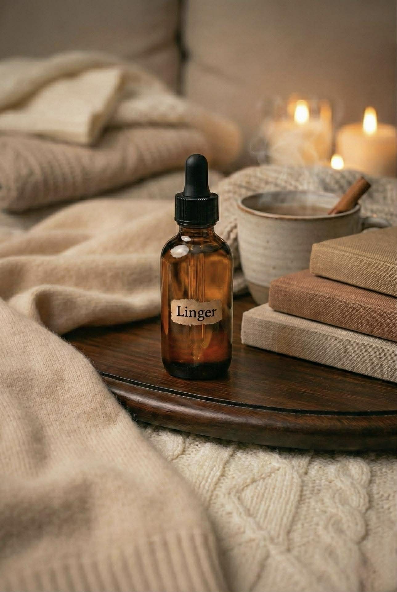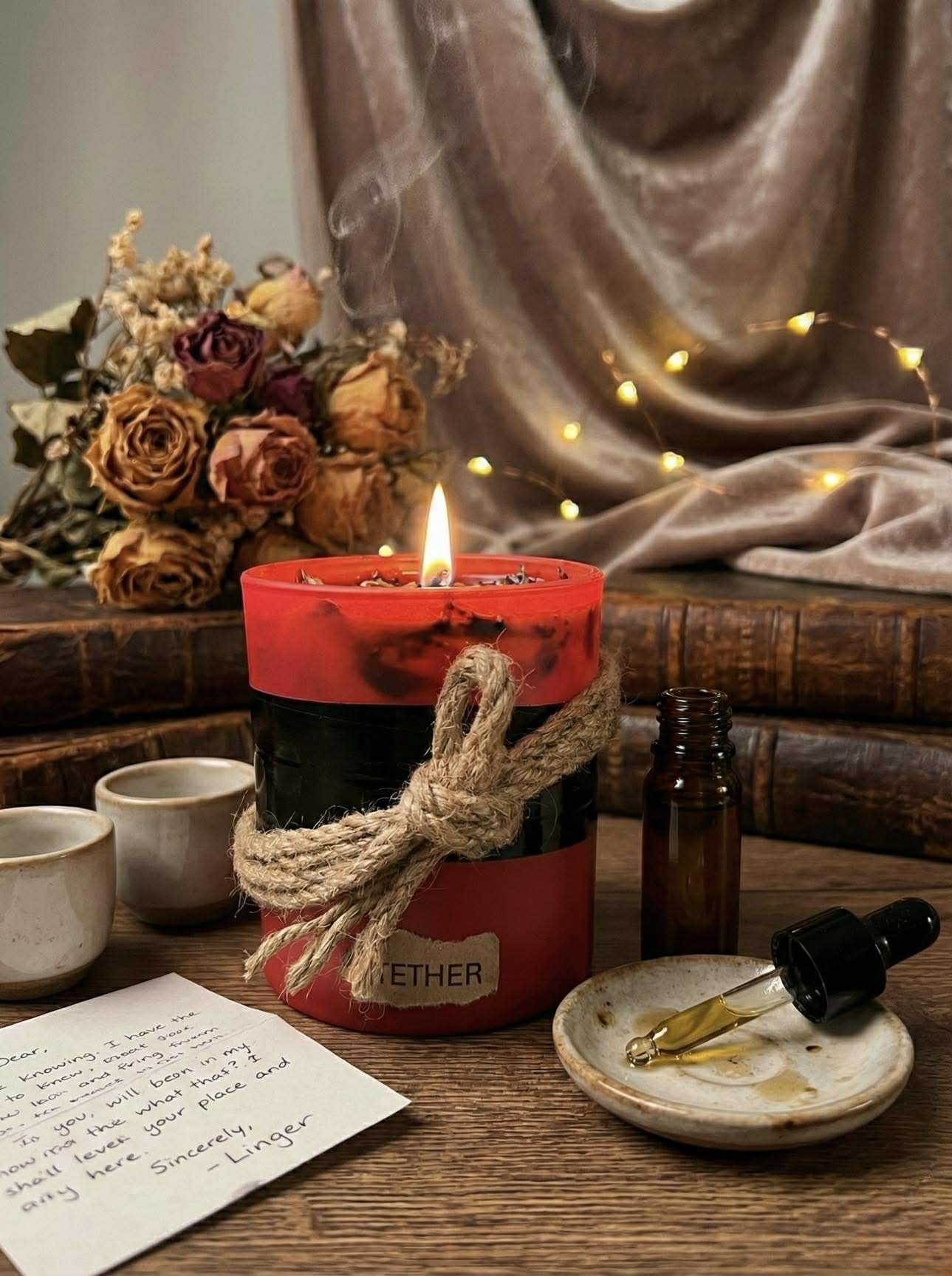 The ritual is a personalized journey, and unfolds through choice. Drops of Linger oil are added into the Tether candle gradually as desired, over time. When to add, how much to use, and when to stop are left entirely to you and/or your partner. Each decision subtly shifts the experience towards balance. This act transforms the bond from mere tension into a more profound emotional connection.
